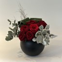 Siyah top vazoda 8 adet kırmızı gül, okaliptus, aspirisya yaprakları ile hazırlanmıştır.
